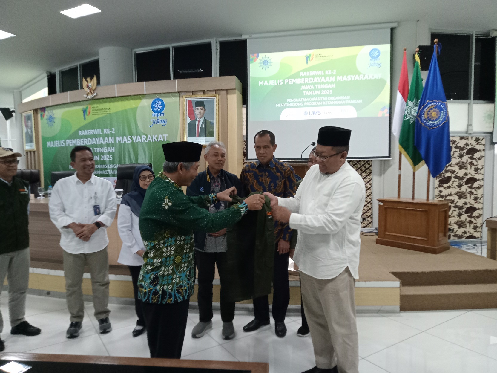 SURAKARTA – Bank Jateng Syariah menyerahkan rompi kepada peserta Rapat Kerja Wilayah (Rakerwil) ke-2 Majelis Pemberdayaan Masyarakat (MPM) Pimpinan Wilayah Muhammadiyah (PWM) Jawa Tengah. Penyerahan dilakukan oleh Kepala Divisi Syariah Bank Jateng, Dr. Slamet Sulistiono, SE., MM., kepada Ketua MPM PWM Jawa Tengah, Ir. Fatchur Rochman, pada Sabtu (6/12/2025).
